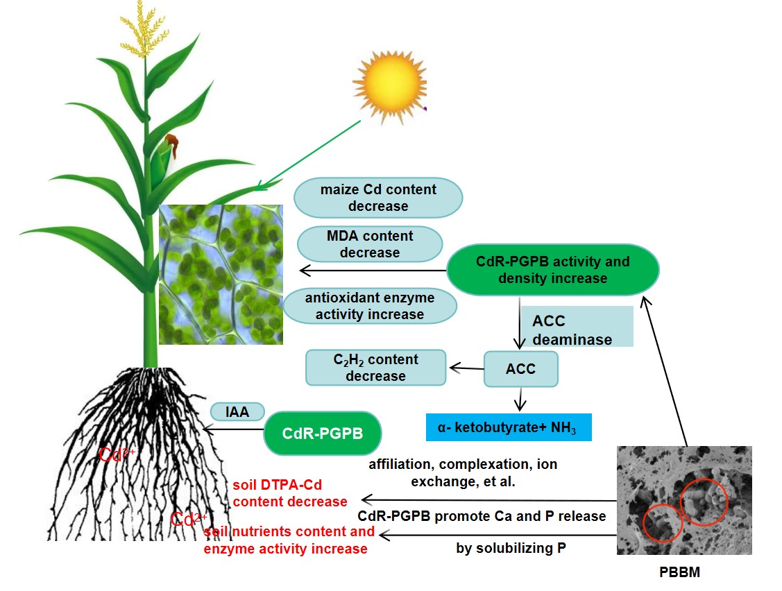镉污染农业种植系统PBBM减少生物有效镉,促进玉米生长发育原理图