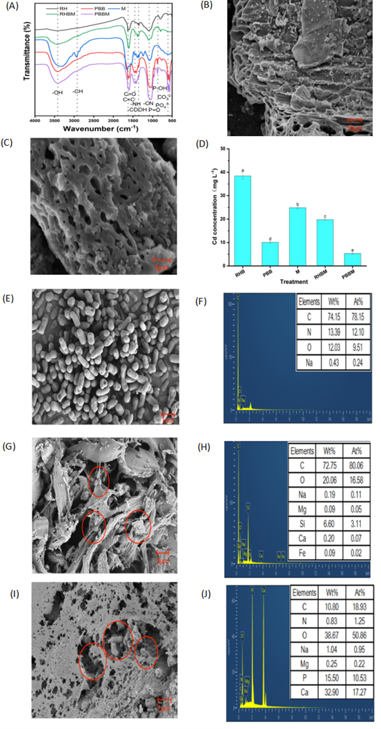 稻壳生物炭(RHB)、猪骨生物炭(PBB)、耐镉植物促生菌(M)、耐镉植物促生菌负载稻壳生物炭(RHB)和耐镉植物促生菌负载猪骨生物炭(PBB)五种材料的电镜扫描图、傅里叶红外和能谱扫描图