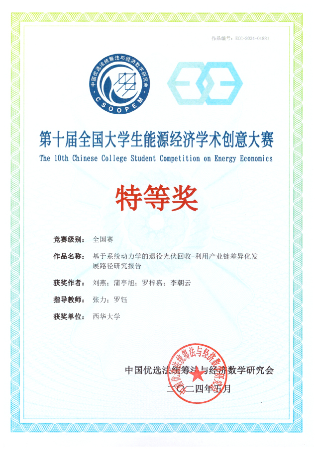 近日,由中国优选法统筹法与经济数学研究会、中国地质大学(北京)和中国高等教育学会资源能源教育分会联合主办,低碳发展管理专业委员会和中国地质大学(北京)承办的第十届全国大学生能源经济学术创意大赛全国总决赛在北京举行。经过校赛、区域赛、全国赛三级赛制的激烈评选后,西华大学学子再创佳绩,荣获全国特等奖1项、全国一等奖1项、全国二等奖1项,区域赛一等奖3项、区域赛三等奖2项。