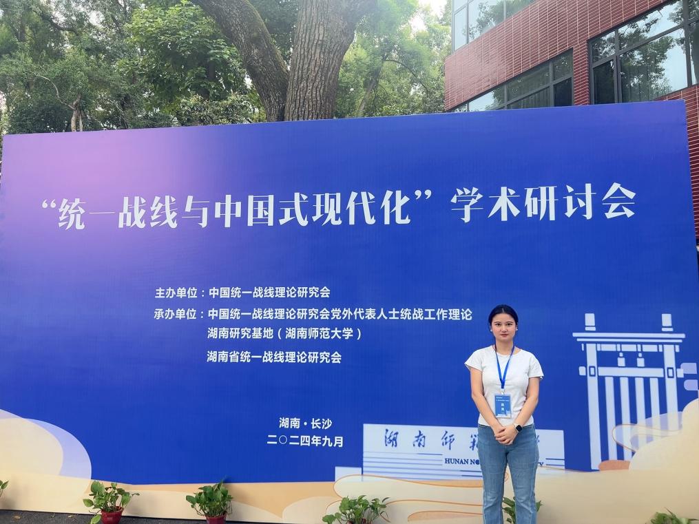 9月10日,“统一战线与中国式现代化”学术研讨会在湖南师范大学召开,此次研讨会由中国统一战线理论研究会主办,中国统一战线理论研究会党外代表人士统战工作理论湖南研究基地(湖南师范大学)、湖南省统一战线理论研究会承办。中央统战部、中国统一战线理论研究会和湖南省委统战部有关领导出席本次会议,来自福建省、广东省、甘肃省等全国各地的专家学者受邀参与此次会议。其中,博士研究生六人、硕士研究生三人,我院2022级马克思主义理论研究生母金兰受邀参与此次会议。