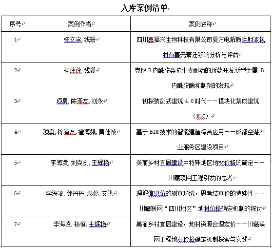 此次入库的案例涉及《合理安全用药指导下的药物设计、制备和质量控制案例分析》《建筑业转型升级与高质量发展下智能建造与创新管理》《美丽乡村宜居建设,地材资源合理定价——川藏地区地材资源分布及价格确定机制探索》等主题案例项目,入库案例的7个案例均具有时代性、引领性、学理性。下一步,学校将持续开展主题案例征集,鼓励专家学者扎根中国实践,讲好中国故事、传播中国声音,开发具有良好学术容量、高学理含量的高水平原创案例,为提高学校实践创新型人才培养质量做出更大贡献。