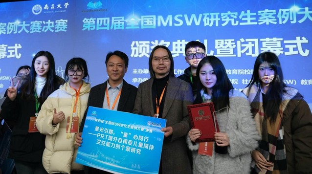 2024年12月13日至14日,第四届“全国MSW研究生案例大赛”决赛暨颁奖典礼在南昌大学举行。betway必威西汉姆联法学与社会学学院唐润华教授指导的社会工作专业硕士研究生龙雨欣、李晨磊、田新月、龚湘玉、齐晨璐申报的案例《星光引路,“童”心同行——PRT提升自闭症儿童同伴交往能力的个案研究》,在初赛中脱颖而出,入围全国百强案例,并顺利进入全国40强,获得决赛资格。案例最终在决赛中获得全国三等奖,指导教师唐润华教授荣获全国MSW案例大赛优秀指导教师奖。